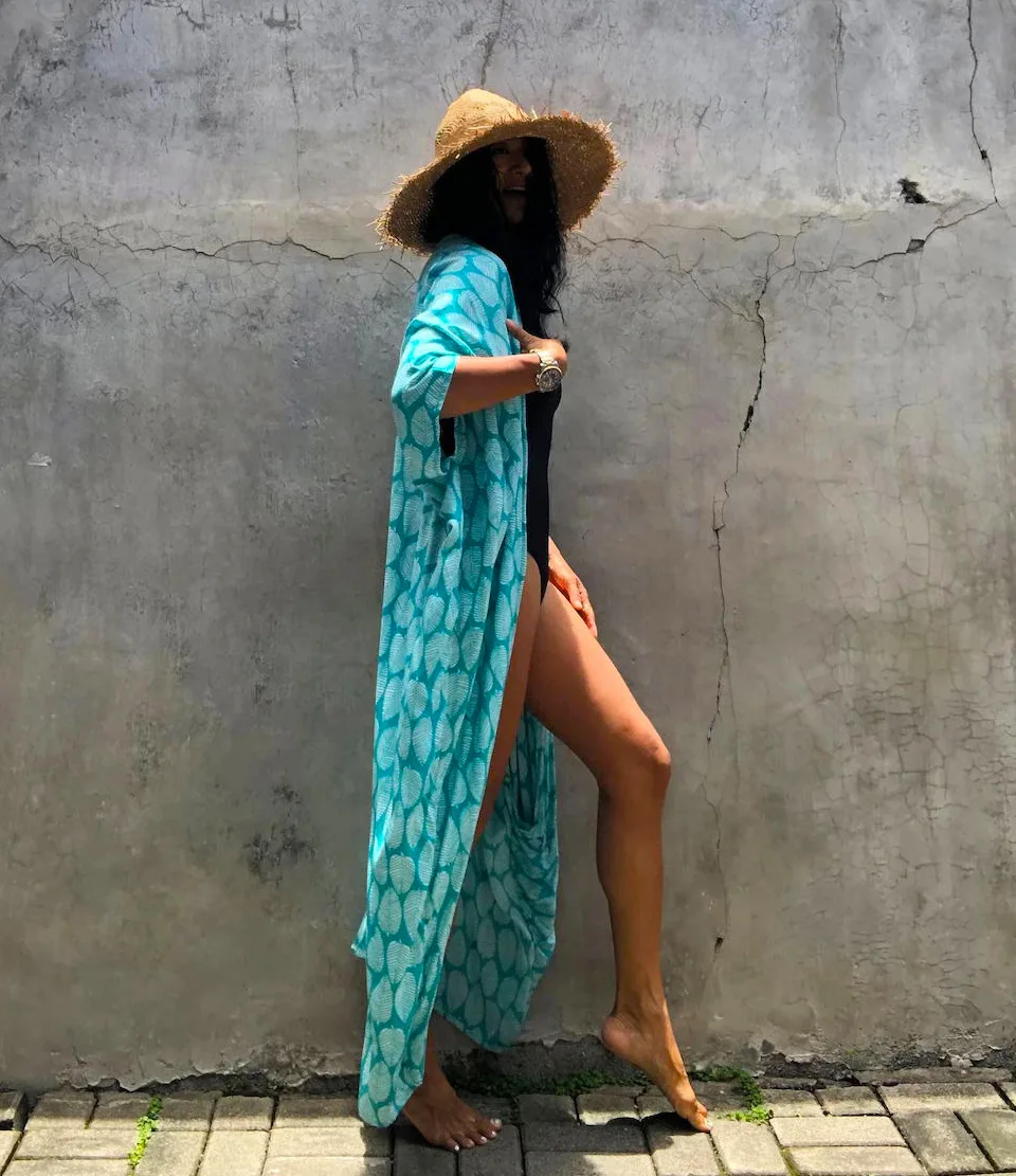 Kimono de plage léger bleu cyan | Feuille