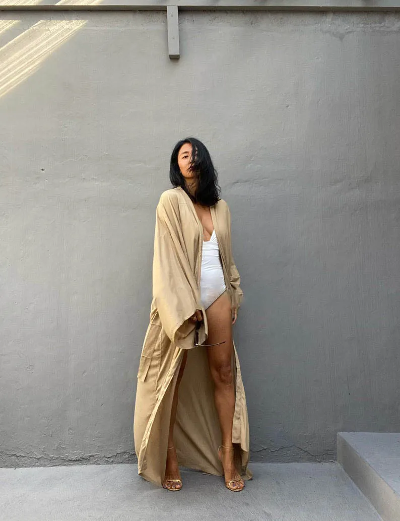Adoptez la veste kimono longue beige et composez votre look signature