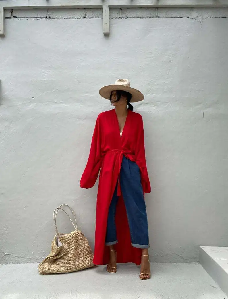 Une veste kimono longue rouge qui sublime toutes vos silhouettes