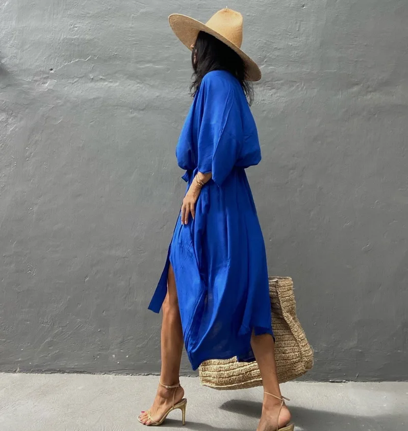 Plongez dans l’élégance du bleu royal avec notre robe de plage kimono unie, conçue pour capturer la lumière et sublimer toutes les carnations. Cette tenue de plage chic est votre indispensable pour afficher un look immédiatement raffiné sur le sable, tout en adoptant un style estival minimaliste qui ne passe pas inaperçu.