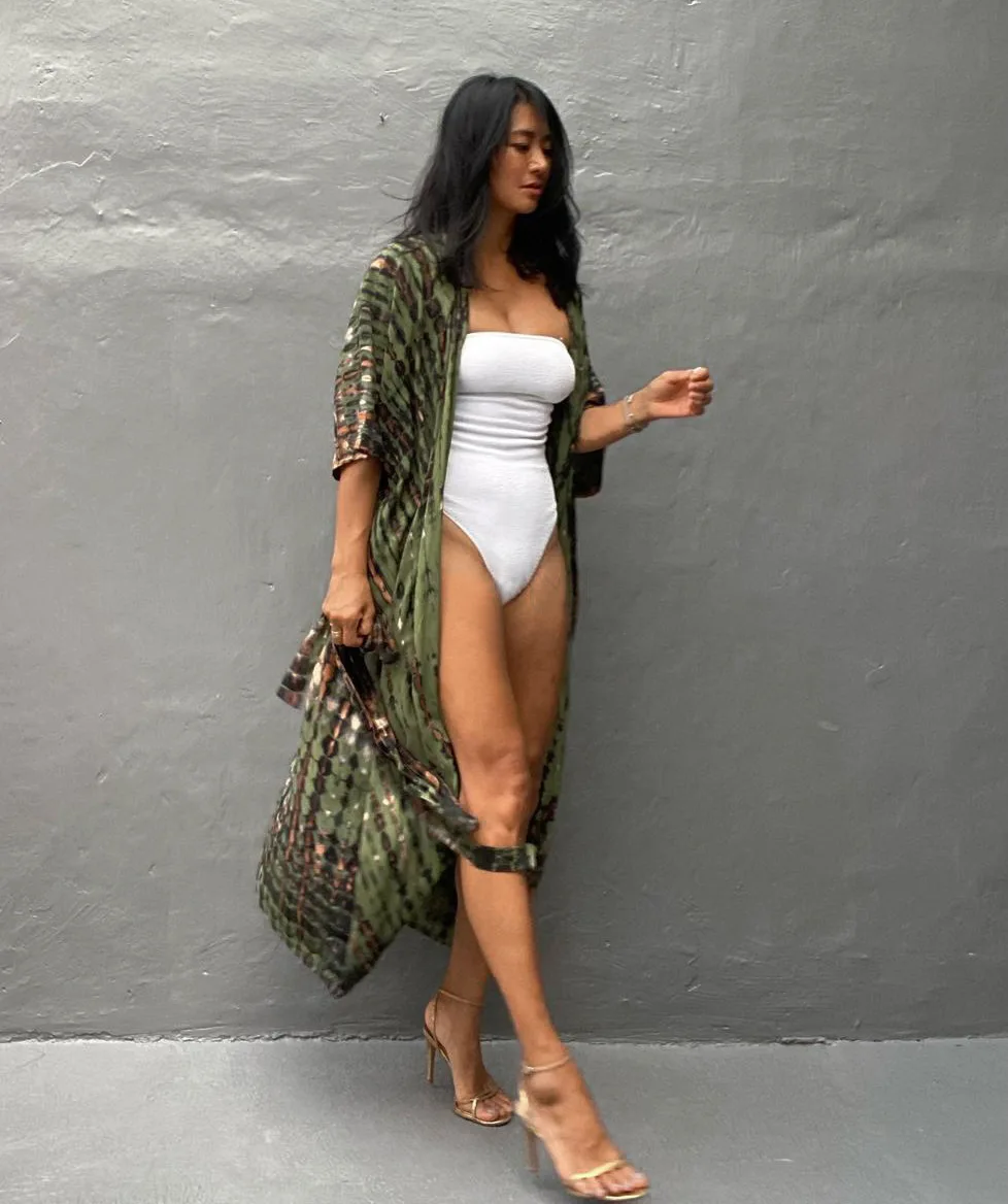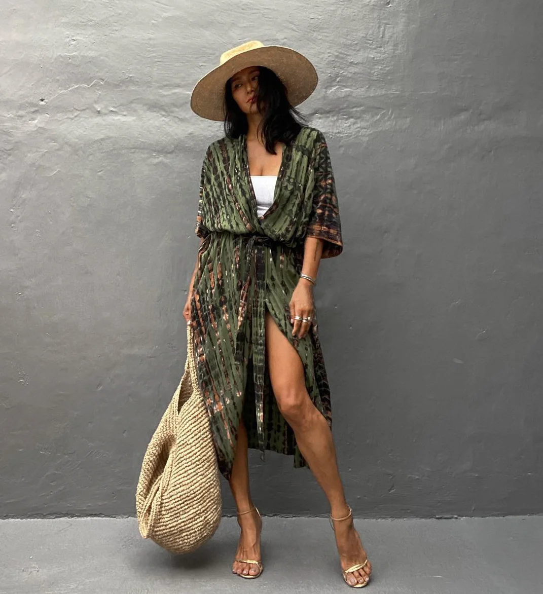 Quelles que soient vos activités, emportez la Robe Kimono De Plage Verte | Tie-dye partout. Glissez-la dans votre valise et faites vibrer chaque coucher de soleil grâce à une tenue bord de mer qui fera de vous la star de l’été.