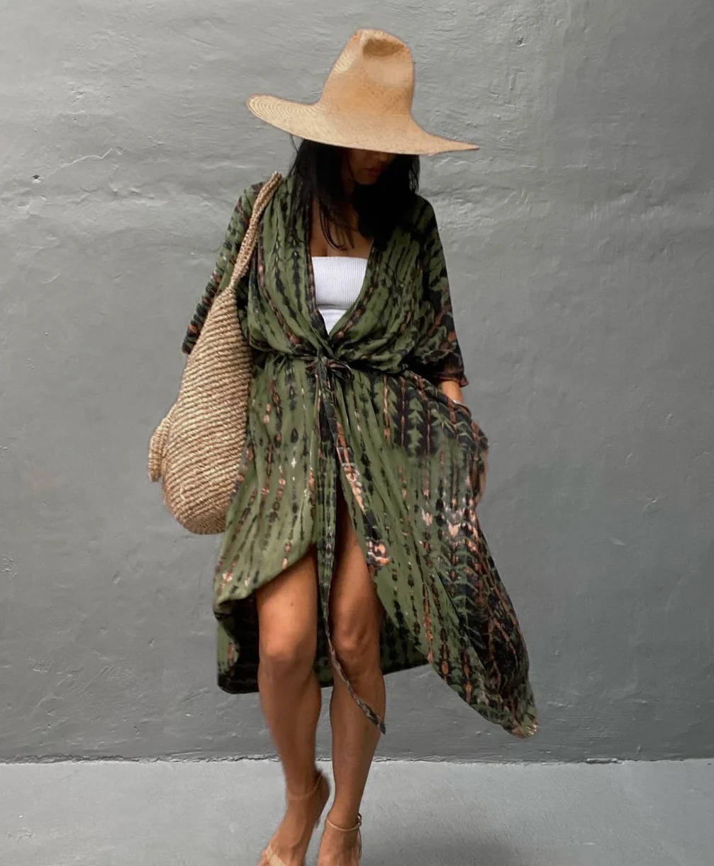 Faites vibrer l’été avec la Robe Kimono De Plage Verte | Tie-dye