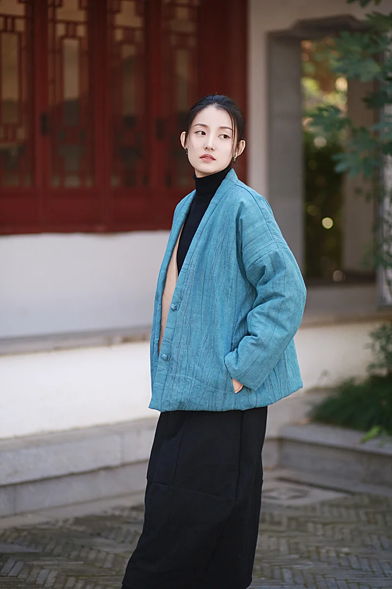 Du premier café à la golden hour : vivez la veste kimono matelassée bleue pour femme élégance et simplicité